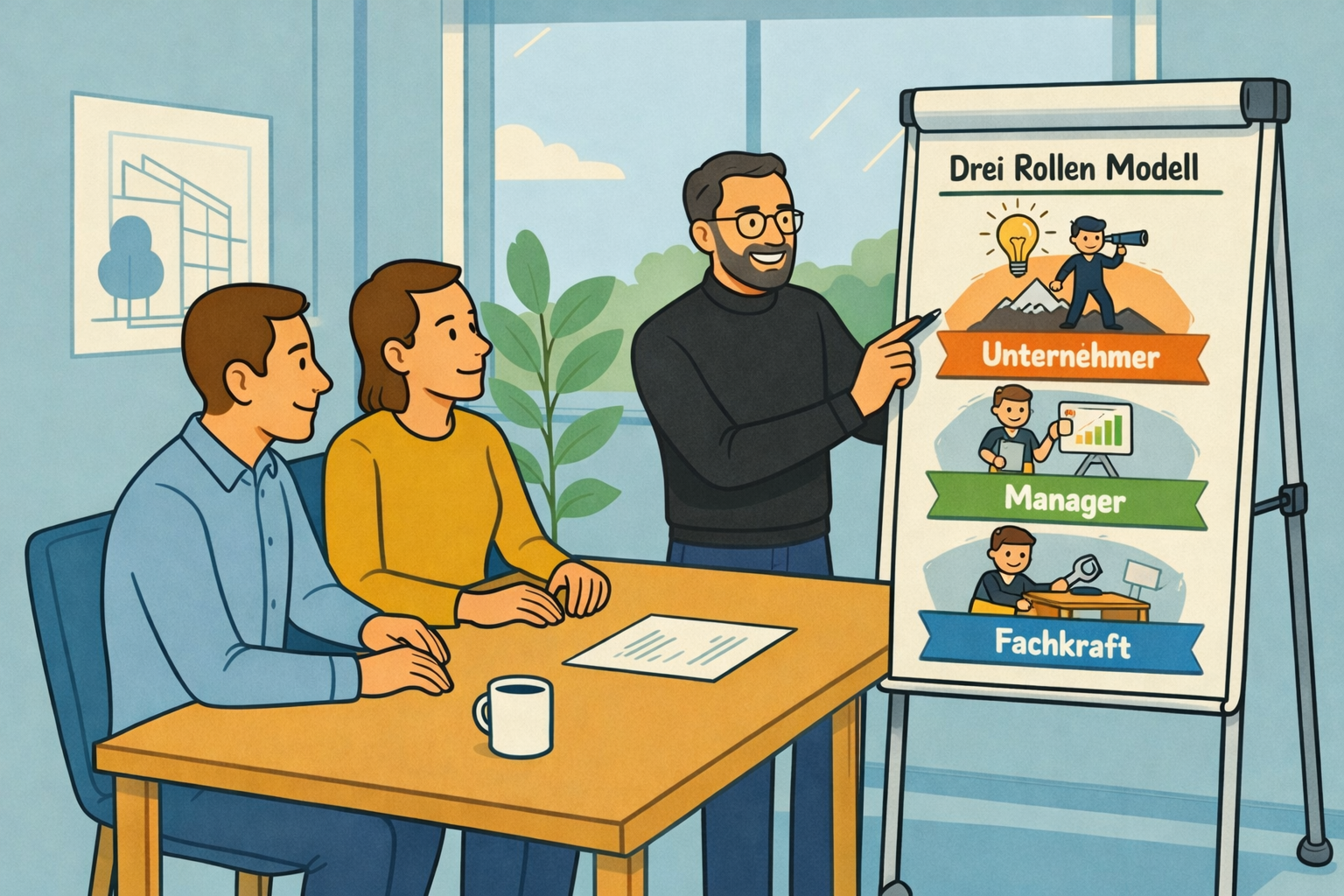 Der Halbtages-Workshop vermittelt dir das Grundwissen über das berühmte 3-Rollen-Modell von Michael E. Gerber: